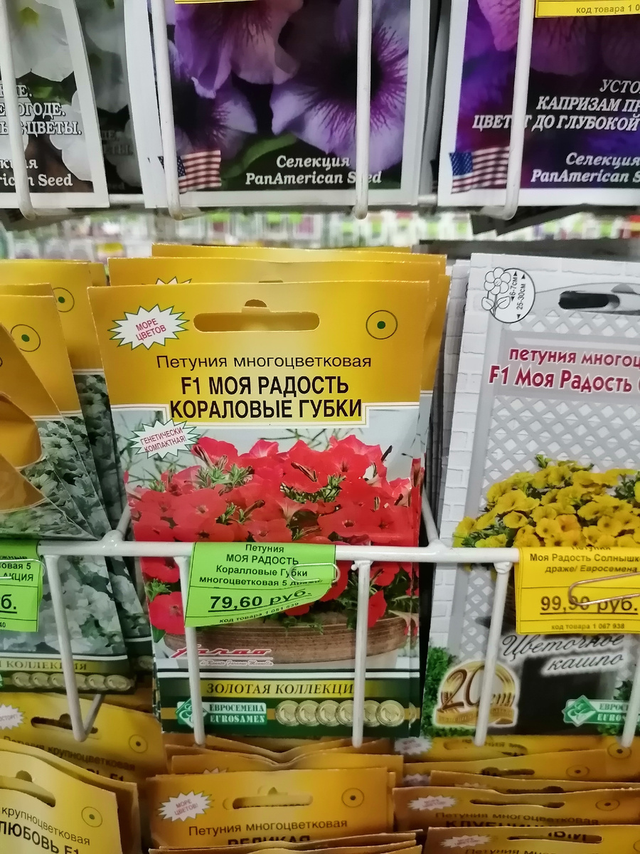 Недавно я забегала в садовый магазин - хотела докупить пару-тройку пакетиков семян. Заодно, конечно, пробежалась по витринам. Около стенда с петуниями притормозила - было интересно, продолжается ли практика выдумывания сортов и их названий. А там все не так очевидно оказалось. Петунии-то я несколько лет уже не сею, пришлось по сети полазить, чтобы понять, что вот это, например - отнюдь не только чья-то безудержная фантазия. По крайней мере, серия MyJoy вполне существует, это многоцветковые петунии. Название сорта пусть останется на совести фасовщика, потому что итальянская компания Farao на своем сайте указывает название 'Salmon Coral'. А как вам вот это? На сайте фасовщика - Petunia multiflora Piramida white F1. Беглый поиск по этому названию не дал ничего. Наверное, если закопаться с головой, можно понять, что они имели в виду) А можно и не понять, конечно. Там на сайте еще много чего есть, например, вот такое: И что-то гложут меня сомнения, что слово "пороша" будет использовать кто
