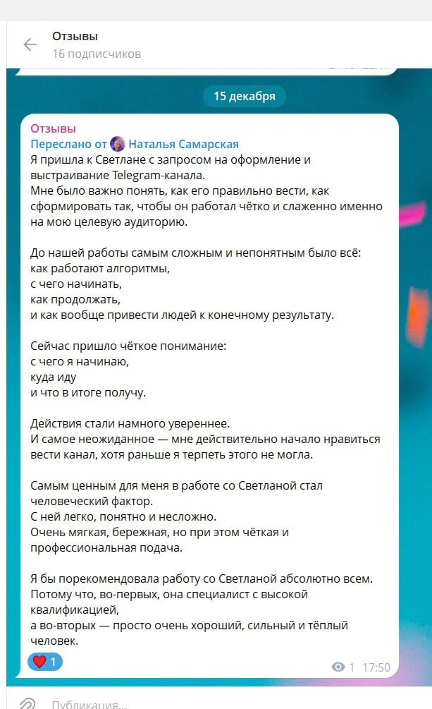 — это не рост подписчиков и не цифры. А момент, когда человеку становится не страшно и понятно, что делать дальше. 7⃣ Именно с таким состоянием ко мне приходит большинство экспертов. Умных, сильных, с опытом — но с ощущением путаницы и внутреннего напряжения от Telegram. Хочу поделиться отзывом Натальи — он очень точно отражает, что происходит в нашей работе. Я пришла к Светлане с запросом на оформление и выстраивание Telegram-канала. Мне было важно понять, как его правильно вести, как сформировать так, чтобы он работал чётко и слаженно именно на мою целевую аудиторию. До нашей работы самым сложным и непонятным было всё: как работают алгоритмы, с чего начинать, как продолжать, и как вообще привести людей к конечному результату. Сейчас пришло чёткое понимание: с чего я начинаю, куда иду и что в итоге получу. Действия стали намного увереннее. И самое неожиданное — мне действительно начало нравиться вести канал, хотя раньше я терпеть этого не могла. Самым ценным для меня в работе с