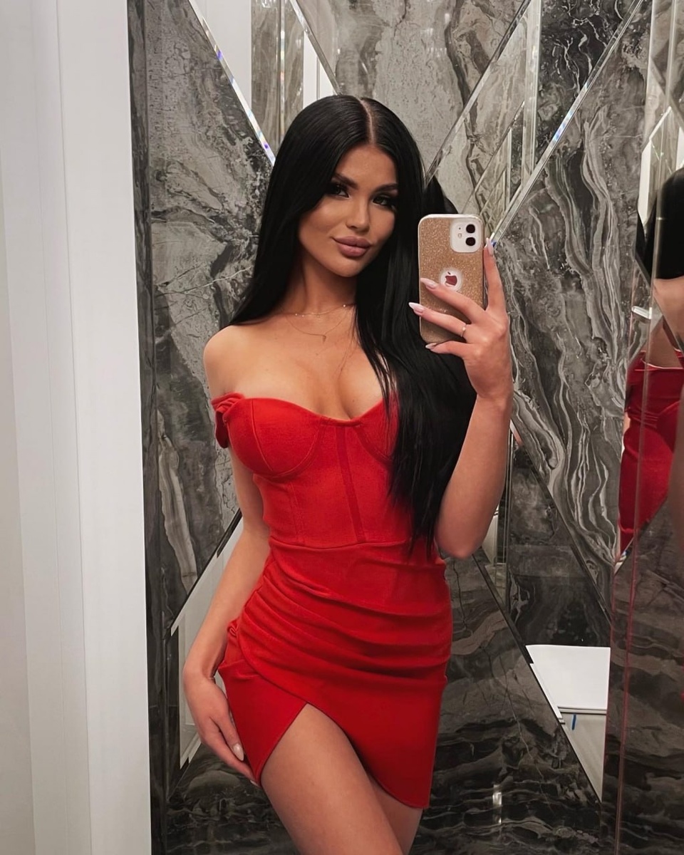 Её длинные чёрные волосы ниспадают каскадом, обрамляя лицо, словно тёмная ночь, контрастирующая с алым нарядом. Взгляд, отражённый в зеркалах, полон уверенности и лёгкой игривости — она знает свою силу, знает, как завораживать.
