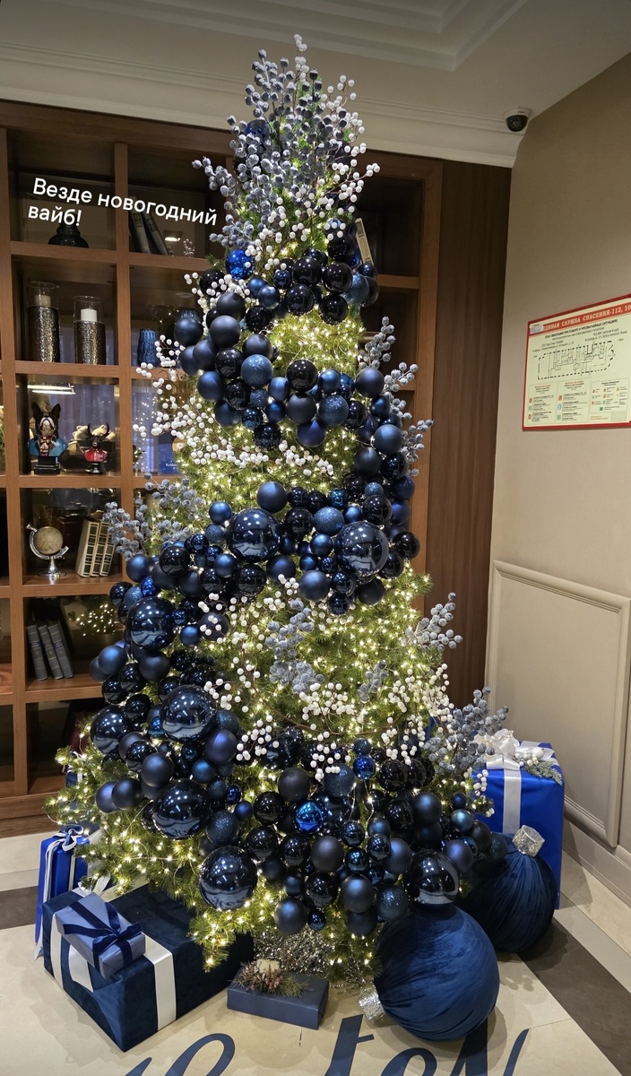 Праздник начинается с деталей. С ёлки, украшенной глубокими синими шарами и мягким тёплым светом. Она стоит уверенно и спокойно, будто знает: всё на своих местах. Подарки у её основания — обещания, которые ещё не раскрыты.
