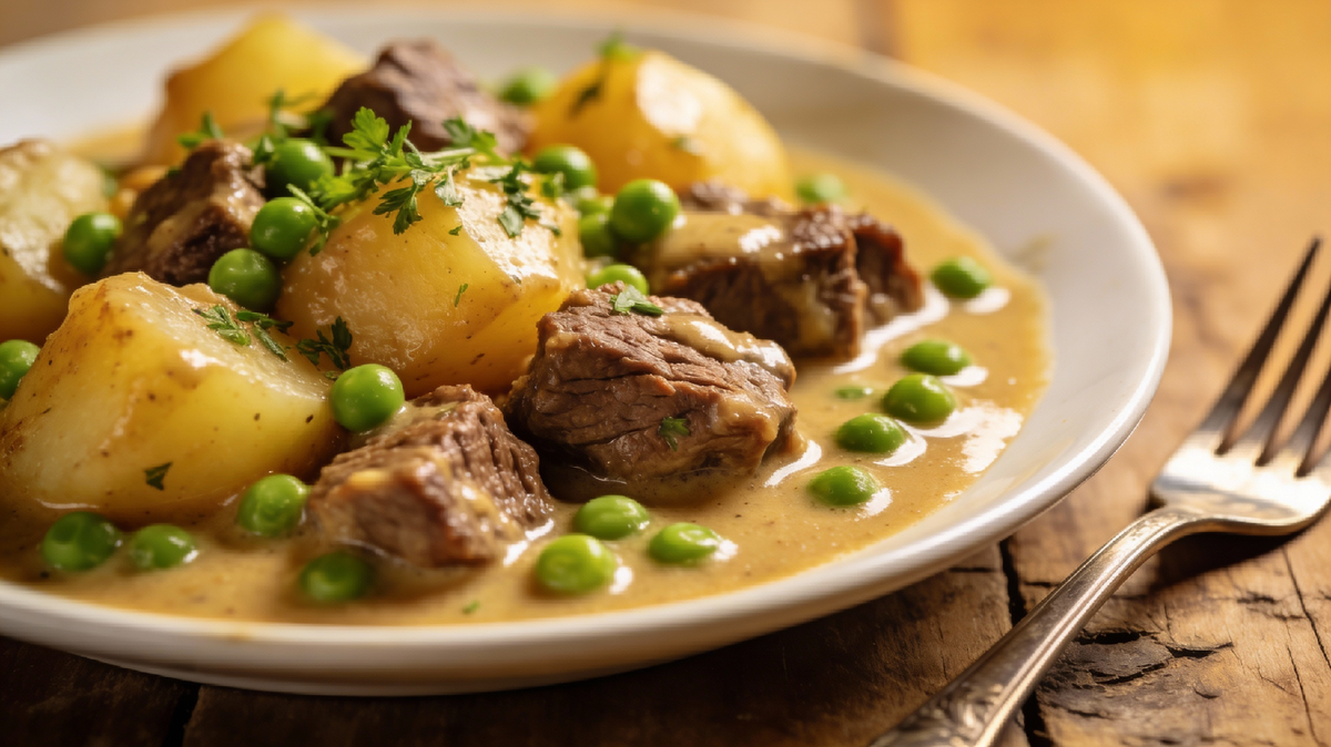 Тушёная картошка с мясом и зелёным горошком — это простой, понятный и очень уютный домашний ужин. Нежные кусочки мяса, мягкий картофель и сладковатый зелёный горошек в ароматном подливочном соусе. Всё готовится в одной глубокой сковороде или сотейнике, без лишней посуды. Отличный вариант на каждый день, который накормит всю семью и обойдётся совсем недорого.