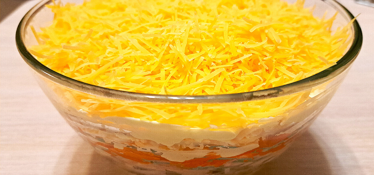«Ванька кучерявый» — идеальный салат на Новый год — салат со шпротами и маринованными огурцами. Сытный, слоеный, с изюминкой, знаменит с советских времен! Любителям шпрот и рыбных салатов, салат "Ванька Кучерявый" несомненно понравится. Вкусный, простой и быстрый в приготовлении бюджетный салатик! Все как я люблю, в одном рецепте. Для "кудрей" Ваньки я взяла сыр Чеддер красный, мне хотелось, чтоб Ванька был непременно рыжий!)) Ингредиенты: шпроты - 240 гр; яйцо варенное (вкрутую) - 4 шт; морковь варенная - 1 шт; огурцы соленые/маринованные небольшие - 3 шт; сыр - 100 г; картофель - 3 шт; лук репчатый - 1 шт; соль - 0,5 чайной ложки; сахар - 1 чайная ложка; уксус 9% - 2 ст.ложки; майонез - по вкусу Сначала замаринуйте луковицу, нарезанную полукольцами, в смеси уксуса, воды и сахара на 20 минут. Отварите картофель, морковь и яйца. Сборка салата происходит слоями, каждый слой промазываем майонезом. 1-й слой — натертый на крупной терке картофель, смазанный майонезом 2-й слой — банка шпр