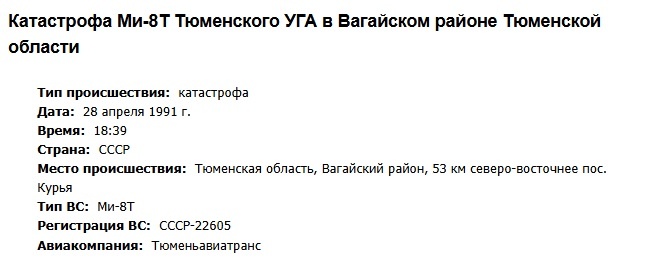 Вечером 28 апреля 1991 года во время полёта из села Абатское (Тюменская обл.) в г. Ханты-Мансийск пропал пассажирский вертолёт Ми-8, перевозивший группу вахтовиков. Поиски вертолёта, к которым привлекли даже экстрасенсов, не дали никаких результатов. Лишь в феврале следующего года в районе г. Тобольск группой лесорубов был найден сгоревший вертолёт. Все 13 человек, находившиеся на нем, погибли.