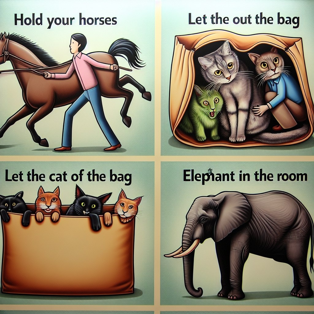 🐶🐱 "Hold your horses" - "Придержи коней". Это означает подождать или замедлиться, не торопиться. 🐎 "Let the cat out of the bag" - "Выпустить кота из мешка". Это значит случайно раскрыть секрет. 🐱 "Elephant in the room" - "Слон в комнате". Это означает проблемная или неудобная тема, которую все игнорируют. 🐘 Пример: - "He wanted to let the cat out of the bag about the surprise party." - "Он хотел выдать секрет о вечеринке-сюрпризе."