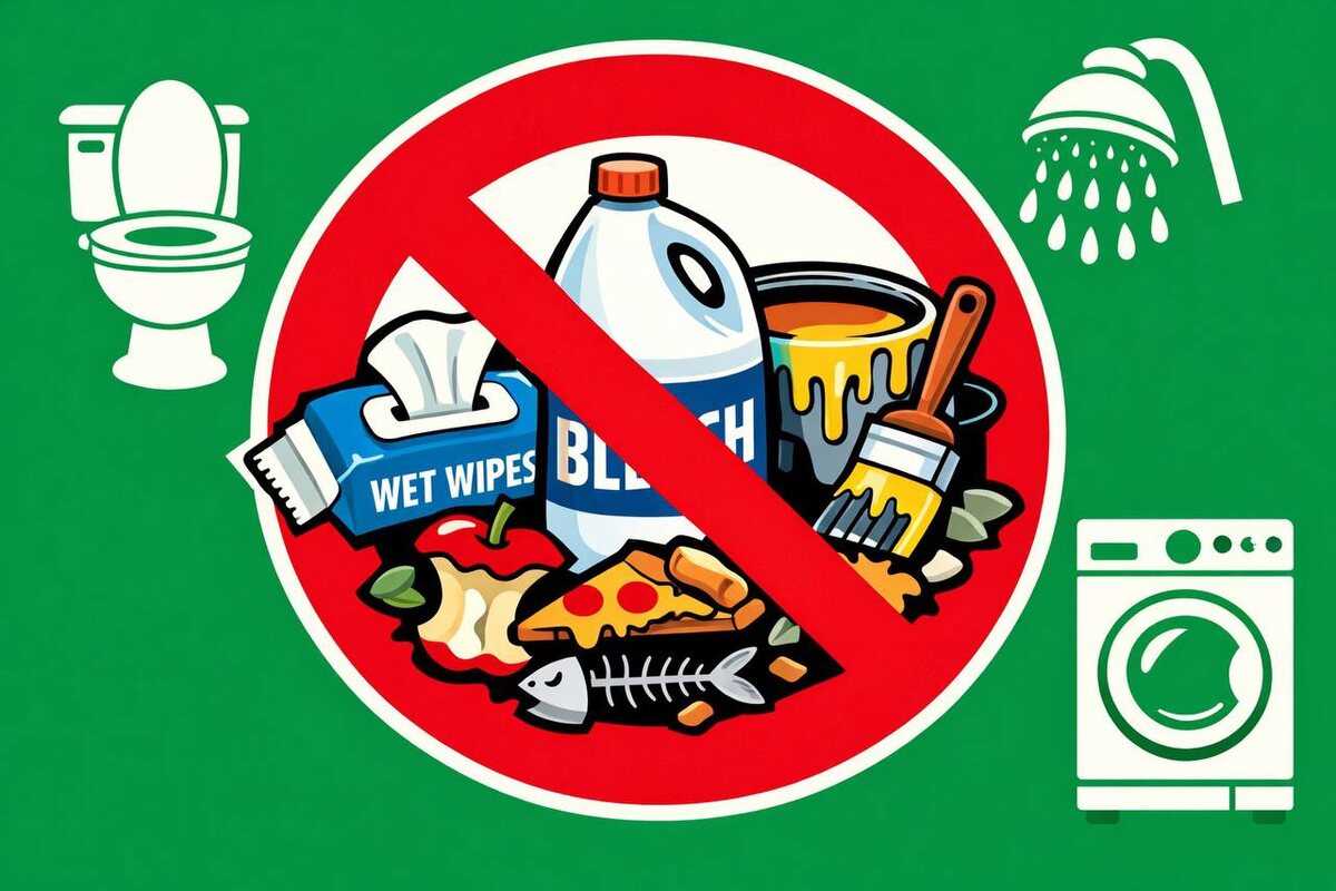 Один неверный слив может остановить работу всей канализационной системы и потребовать дорогого ремонта. Запомните 3 категории «врагов», которые нельзя отправлять в септик никогда. 1. Неразрушаемые предметы (засорят и сломают насосы): Влажные салфетки, средства гигиены, нитки, волосы, презервативы, сигареты. 2. Химические убийцы бактерий (уничтожат микрофлору): Хлор, антисептики, лекарства, кислоты, щелочи, антифриз, краска, растворители. 3. Органический мусор (вызовет жировой засор и запах): Остатки еды, жир, масло, кофейная гуща. Ваш септик — не мусорный бак. Это живая система. Один неверный слив может обернуться отказом дренажа, зловонием на участке и счетом от сервисной службы. --- Уже слили что-то запрещенное? Не ждите последствий. Вызовите срочную диагностику и промывку системы от специалистов «Воды и Септика». Сохраните бактерии и свой бюджет.