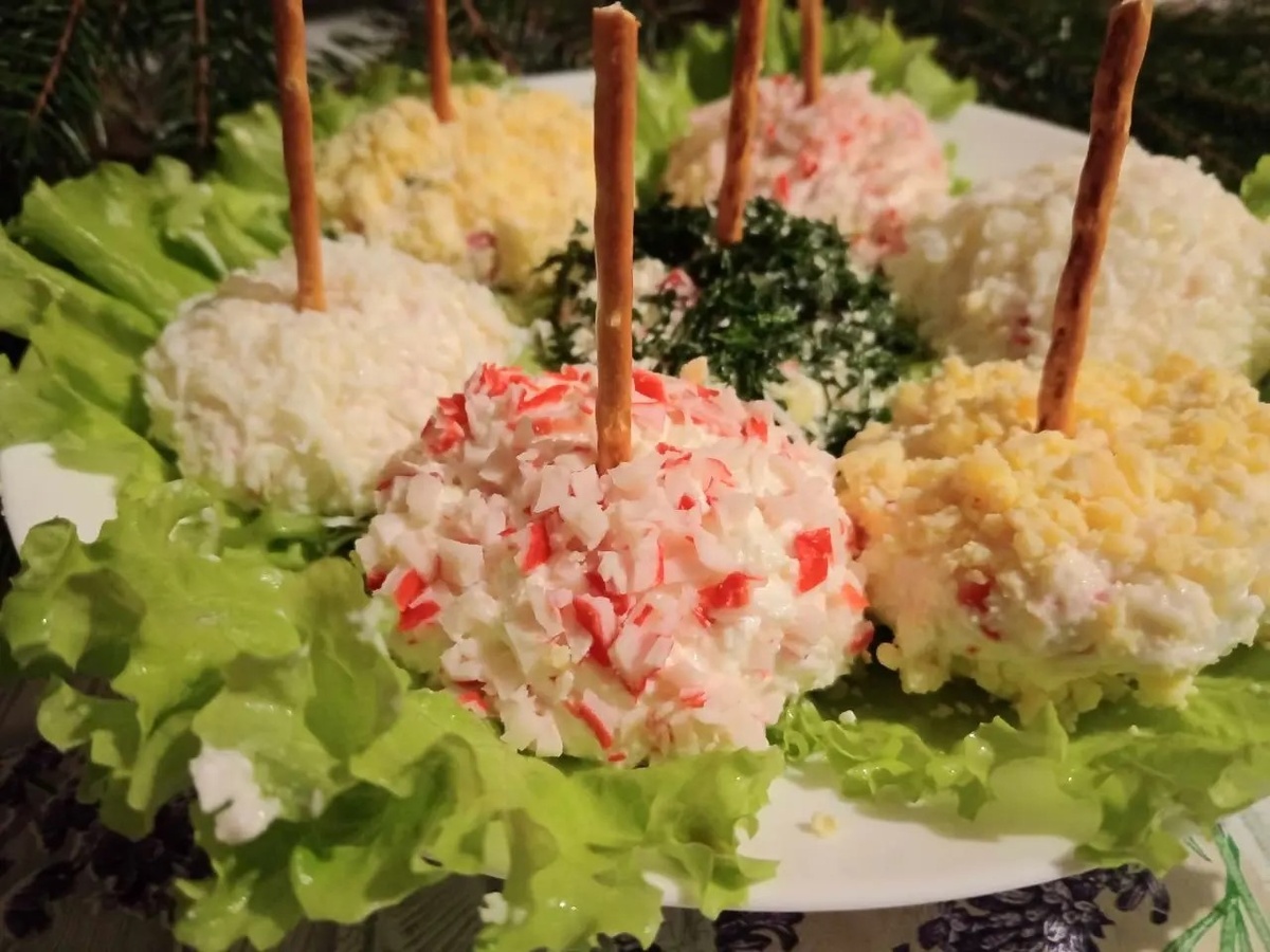 Также мелко рубим укроп и нарезаем немного дополнительных крабовых палочек. У нас получается 4 разноцветных "панировки"! Выкладываем каждую в свою тарелочку. Шаг 3: Лепим красоту.