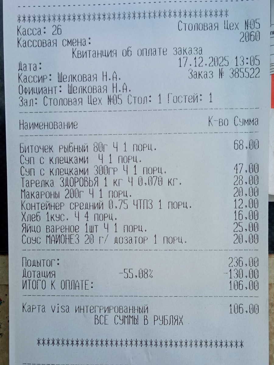 Нет, сынок, это не фантастика, а заводская столовая: Всё ещё не перестаю удивляться тому, как здесь кормят, а после длительного больничного посещение столовой словно в первый раз. И по традиции здесь два приёма пищи: салат, а-ля коул слоу, яйцо, хлеб и суп, которого насыпали так щедро, что плюхнулось мальца через край пока донёс, и на ужин макароны, хлеб и рыбная котлета. Рыбу обожаю, но готовить её дома не особо, а в столовке её готовят изюмительно, за что их и уважаю. *с еженедельными корректировками меню изменяется набор блюд, но в среднем доплата по чеку составляет около 150 руб. Представленный рацион - один из рекордно дешёвых. Продолжаю вести наблюдение.