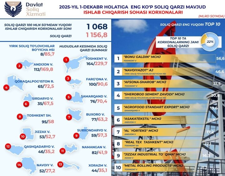 В Налоговом комитете уточнили, что значительная часть долга сосредоточена у ограниченного числа крупнейших должников. Из общей суммы 254,5 млрд сумов, или 22%, приходится на 10 организаций. Такая структура задолженности, когда существенная доля формируется за счёт небольшого круга предприятий, влияет на общую динамику поступлений и определяет необходимость адресной работы по наиболее крупным суммам. В подобных случаях результаты урегулирования задолженности у отдельных организаций способны заметно отражаться на сводных показателях по отрасли.