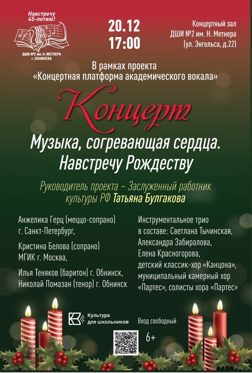 Н. Метнера города Обнинска состоится праздничный концерт «Музыка, согревающая сердца: Навстречу Рождеству». В концертной программе прозвучат произведения, которые создадут атмосферу Рождества и Нового года. Вход свободный. Обнинск, ул. Энгельса, 22. 👍 Подписаться | Ваша реклама