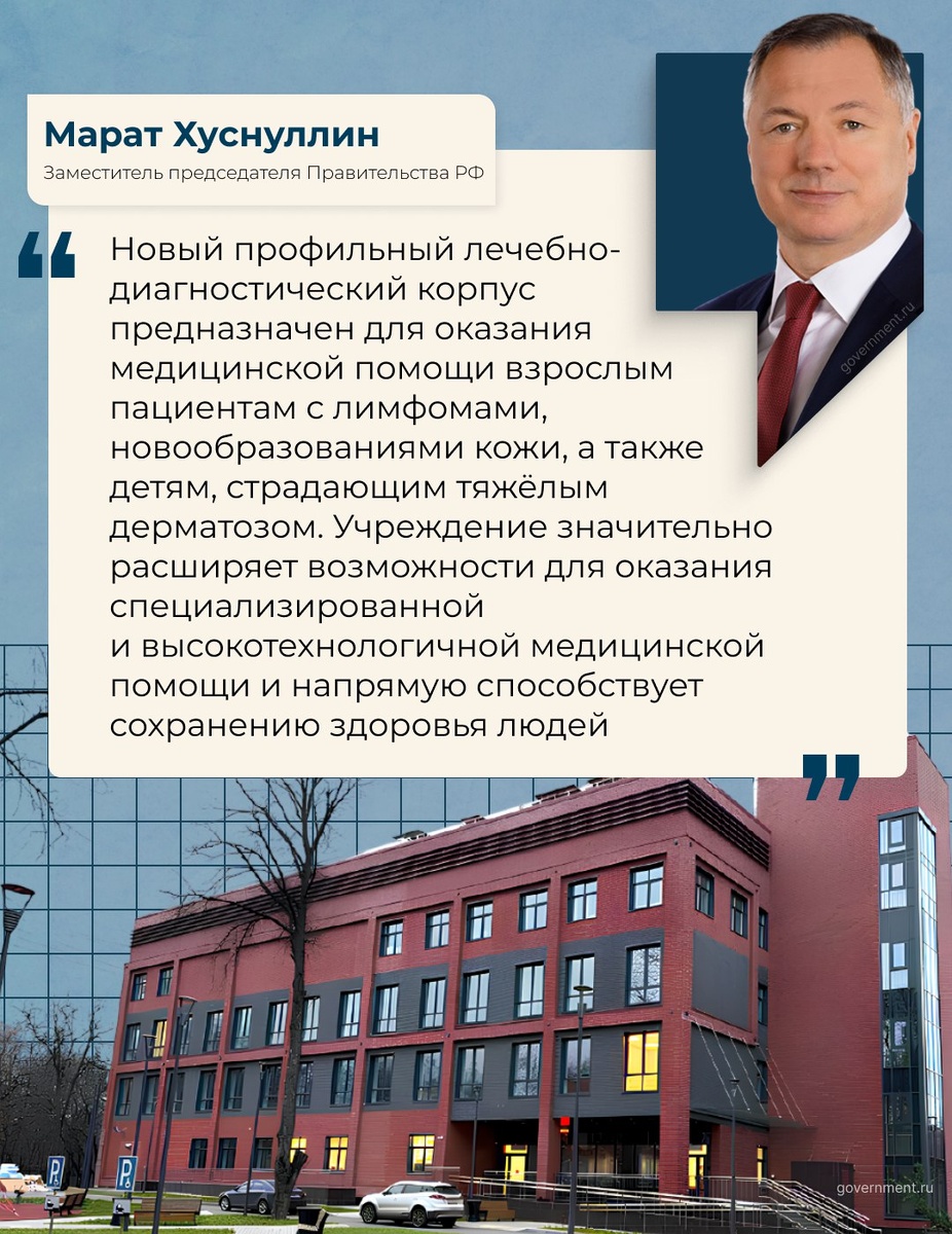 ! В Москве ввели в эксплуатацию новый лечебно-диагностический корпус Центра дерматовенерологии и косметологии МФ, оснащённый новейшим оборудованием и технологиями. Об этом сообщил заместитель председателя Правительства РФ Марат Хуснуллин.