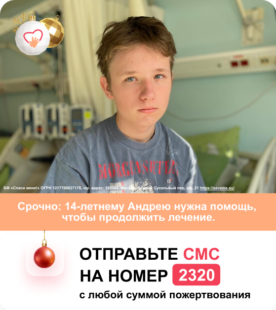 Андрею 14 лет. У него рак. И времени почти не осталось. Всего за несколько дней обычная жизнь подростка превратилась в борьбу за выживание. Диагноз – альвеолярная рабдомиосаркома. Это редкий и агрессивный рак, который не ждёт. Помощь нужна срочно! Андрей мечтает выйти на большую сцену, играть свои любимые мелодии под гул зрительного зала. Но сейчас его гитара молчит, каждый день наш герой борется с редкой агрессивной опухолью, у него РАК, семейство САРКОМ. Время уходит слишком быстро. Лечение возможно, и оно уже началось, но без нашей помощи оно может остановиться. Терапия слишком дорогая, семья в одиночку не сможет найти такие средства. Мы верим, что в это чудесное новогоднее время, наполненное верой и волшебством, Вы сможете протянуть руку помощи Андрею, который отчаянно хочет жить! Андрей Воронов, 14 лет Диагноз: Рак. Альвеолярная рабдомиосаркома Необходимо: Срочное лечение в медицинском центре Сураски (Ихилов), Израиль Сумма сбора: 1 320 000 руб. Лечение Андрея нельзя ставить на па