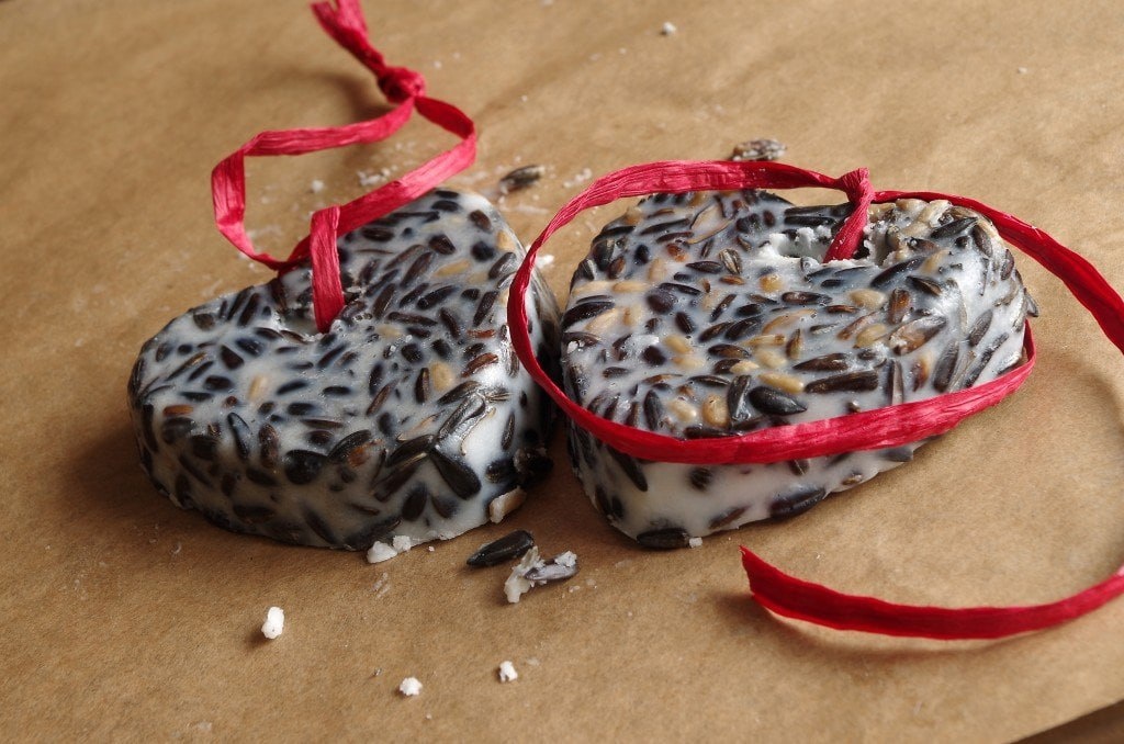 Поздней осенью и зимой птицам приходится тяжело: многие, кто питались насекомыми, улетают на юг, зимующие остаются. В городах крылатым друзьям бывает сложно найти пищу: семена, хлеб, разные зернышки. Поэтому их стоит подкармливать. Предлагаем вам вместе с ребенком сделать угощения для птичек. Зерно (или зерновая смесь) хорошенько перемешивается с растопленным салом (ни в коем случае не соленым!). Заливаем смесь в формочку для печенья и выносим на балкон. Жир застывает на морозе и держит корм, который птицы потом постепенно выклевывают.