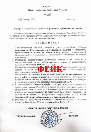 гражданах, пребывающих в запасе». Минобороны Абхазии официально заявляет, что распространяемый текст является подделкой и не имеет юридической силы. Минобороны просит граждан ориентироваться только на официальные источники. Апсныпресс | Instagram Facebook | Дзен ⚠️
