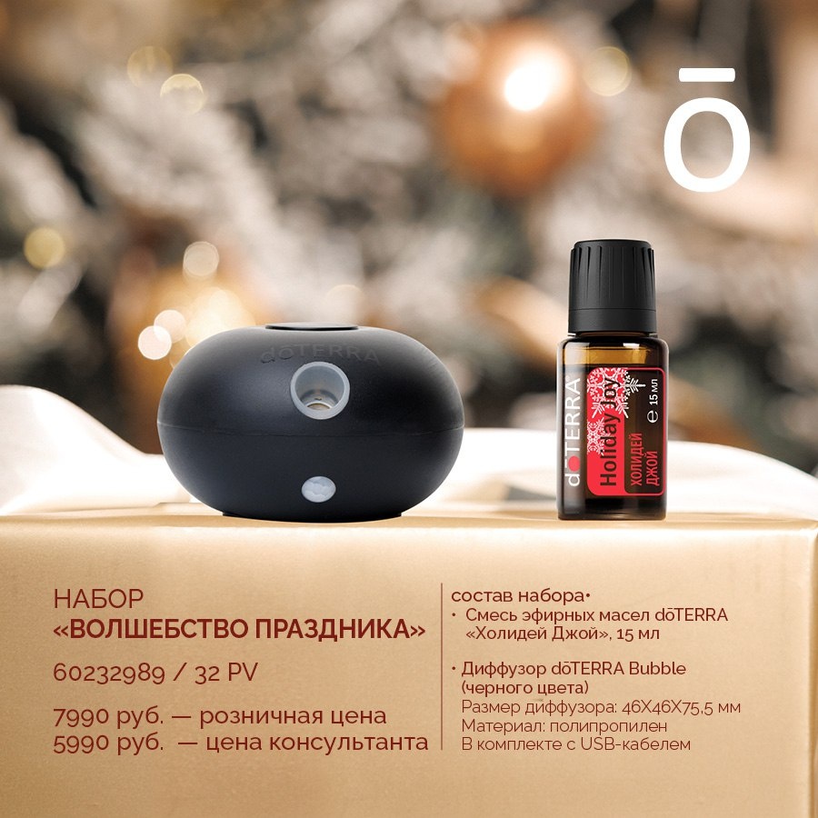 ! 🕯 И не просто волшебством, а ароматом смеси эфирных масел Холидей Джой при помощи маленького и компактного диффузора Bubble черного цвета! ❤️ Холидей Джой – это композиция из дикого апельсина, гвоздики, корицы, кассии, мускатного ореха и ванили, которая мгновенно возвращает нас к самым теплым воспоминаниям, наполняя дом атмосферой счастья и радости. 🔮 Диффузор Bubble черного цвета. Стильный, компактный и мощный. Работает без воды: просто вставьте в него бутылочку с маслом 5 или 15 мл — и он начнет создавать ароматный туман на площади 10 м². Заряжается от USB и работает до 12 часов. А еще он умный — активируется движением! 🏡 Привлечем в дом идеальное праздничное настроение? Тогда точно берем набор Волшебство праздника из нашего Новогоднего каталога dōTERRA!
