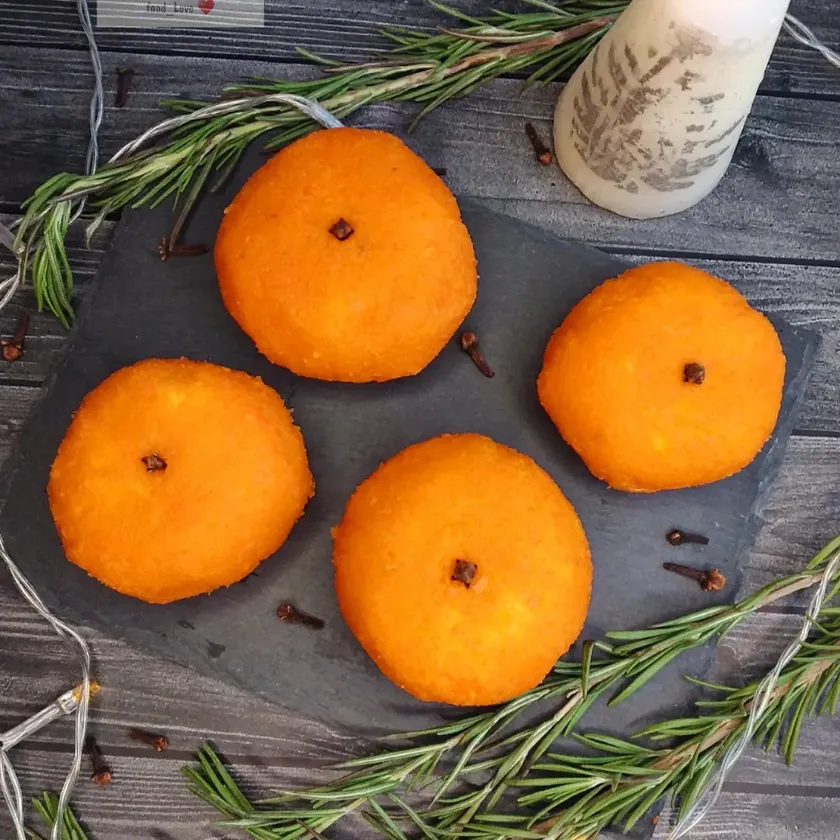 Вкусные куриные «мандарины» с морковью по-корейски — пошаговый рецепт праздничного салата. Яркая и оригинальная закуска для новогоднего стола, приготовленная из куриного филе, яиц, сыра и моркови. Подробное описание с фото: как сформировать салат, украсить гвоздикой и розмарином. Простой и эффектный рецепт горячего, салатов и закусок на Новый год. 1. Филе курицы и яйца отварить до готовности. Остудить. 2. С моркови слить жидкость и измельчить при помощи блендера. 3. Отварную курицу мелко нарезать ножом или измельчить в блендере. 4. Яйца и сыр натереть на крупной тёрке. Смешать с курицей. 5. Чеснок пропустить через пресс. 6. Добавить сметану/майонез. Посолить и тщательно перемешать. 7. Из полученной массы влажными руками сформировать 6 одинаковых шариков. 8. Измельчённую морковь выложить на пищевую плёнку и сформировать лепёшку. 9. В середину положить начинку из курицы и сомкнуть края лепёшки так, чтобы морковь оборачивала весь шарик. Слегка надавить на него сверху и снизу, придавая