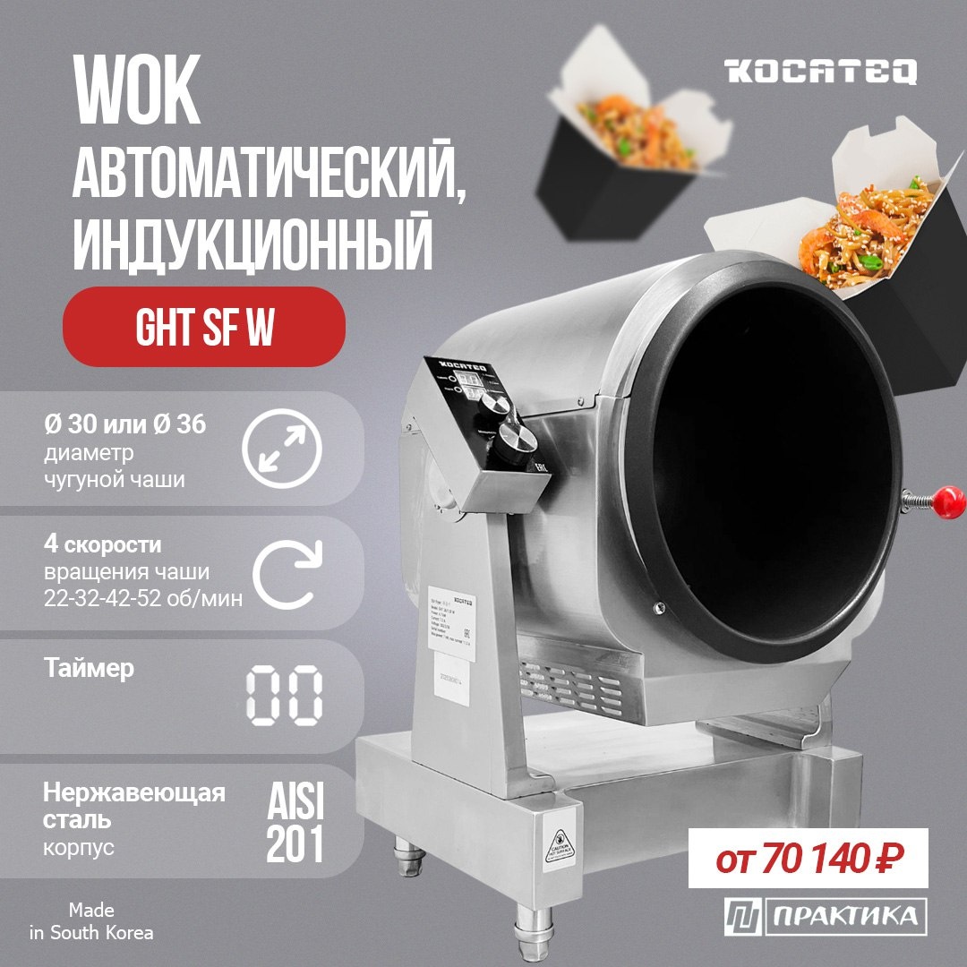 Мы стали получать от вас много запросов на автоматические WOK-станции и именно поэтому решили расширить линейку. Знакомьтесь, новая серия KOCATEQ GHT SF W: аппараты в корпусе из нержавеющей стали, рассчитанные на интенсивную работу в условиях профессиональной кухни. Автоматические WOK-станции KOCATEQ GHT SF W предназначены для быстрого и стабильного приготовления блюд азиатской кухни с минимальным участием оператора. Оборудование обеспечивает равномерный прогрев чаши, точный контроль температурного режима и повторяемость результата, что очень важно при работе в потоке и в часы пиковой нагрузки. МОДЕЛЬНЫЙ РЯД KOCATEQ GHT SF W В линейке представлены 3 модели, отличающиеся диаметром чаши и мощностью, что позволит вам подобрать оптимальное решение под ваш формат и загрузку кухни: GHT 30/5 SF W - диаметр чаши 30 см, мощность 4,7 кВт GHT 36/5 SF W - диаметр чаши 36 см, мощность 4,7 кВт GHT 36/7 SF W - диаметр чаши 36 см, мощность 7 кВт Автоматические WOK-и KOCATEQ GHT SF W - оптимальное