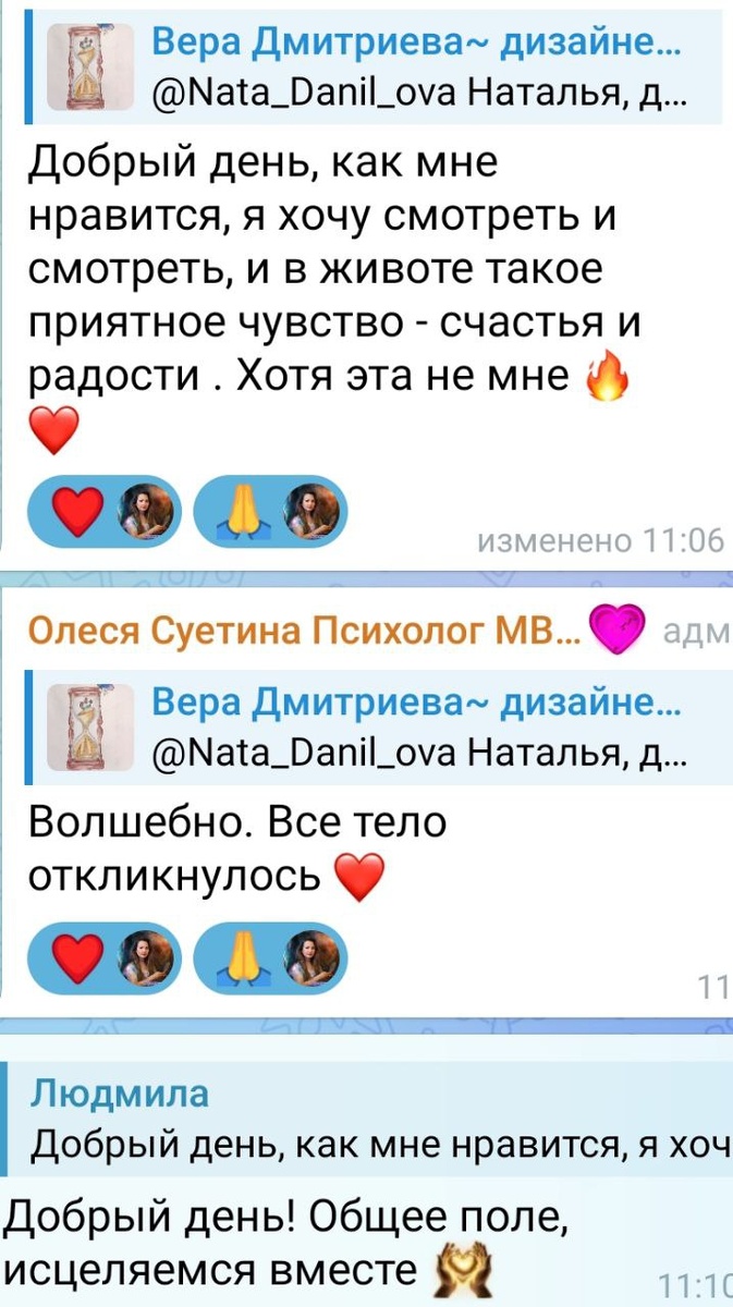 Сейчас в комнате «Палитра исцеления» в портале новой реальности наблюдаю, как мои живые картины откликаются участникам. По-разному, у каждого своё, но всегда точно в запрос. Очень люблю эти моменты — когда процесс прямо на глазах начинает работать.
