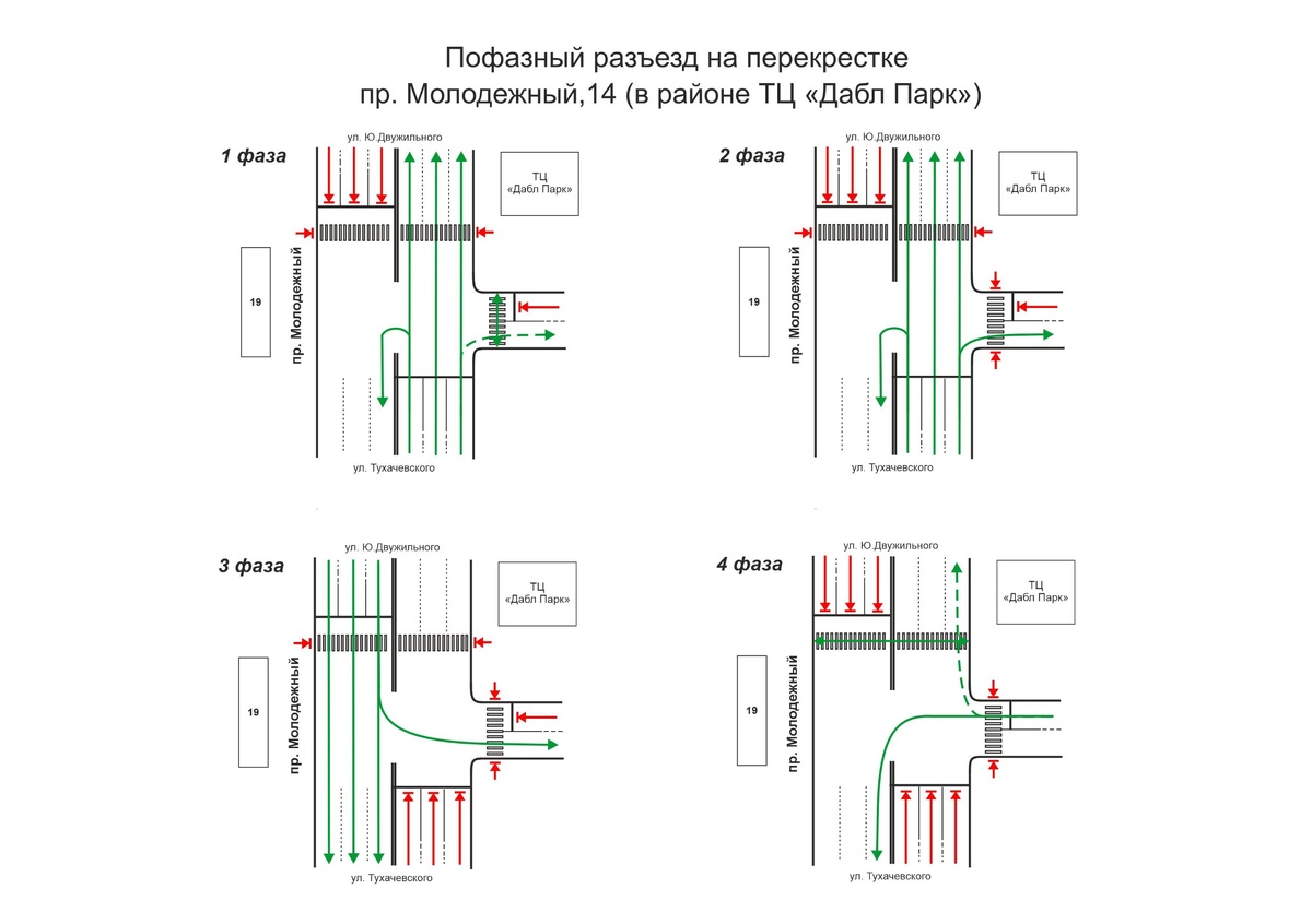 Молодёжном, 14 станет удобнее и безопаснее Завтра, 19 декабря, здесь изменится организация дорожного движения. Специалисты Центра организации дорожного движения разделят транспортные потоки на разные фазы, что позволит улучшить пропускную способность и безопасность на этом участке. Движение будет выполняться следующим образом: 🚦1 фаза - движение транспорта по пр. Молодежному от ул. Тухачевского и пешеходов через междворовой проезд 🚦2 фаза - движение транспорта по пр. Молодежному от ул. Тухачевского без пешеходов 🚦3 фаза - движение транспорта по пр. Молодежному от ул. Ю. Двужильного 🚦4 фаза - движение транспорта по междворовому проезду и пешеходов через пр. Молодежный. #дорогистолицыКуZбасса ❤️ Наш канал в Дзен