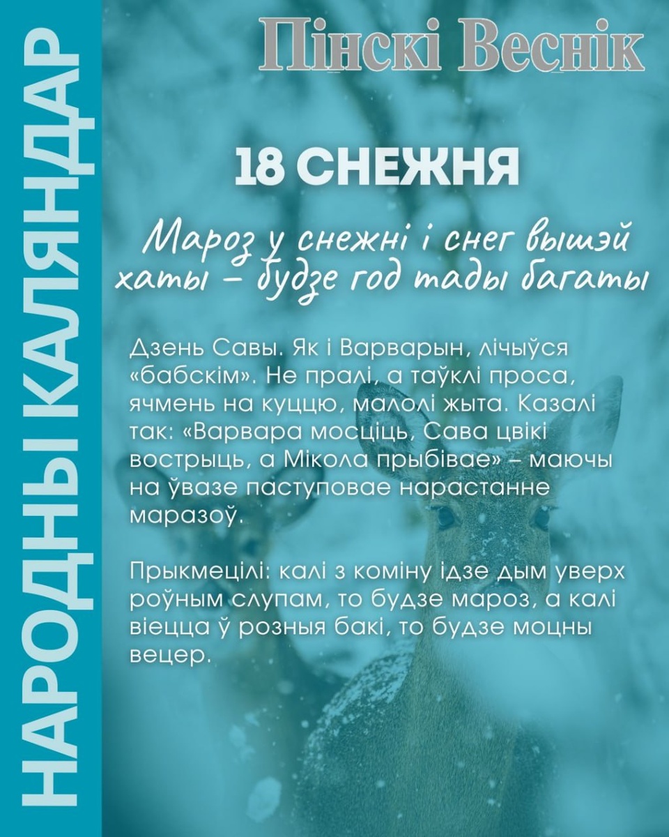 ️⃣ 1️⃣1️⃣1️⃣3️⃣1️⃣5️⃣1️⃣1️⃣ 🔄18 снежня Дзень Савы. Як і Варварын, лічыўся «бабскім». Не пралі, а таўклі проса, ячмень на куццю, малолі жыта. Казалі так: «Варвара мосціць, Сава цвікі вострыць, а Мікола прыбівае» – маючы на ўвазе паступовае нарастанне маразоў. Прыкмецілі: калі з коміну ідзе дым уверх роўным слупам, то будзе мароз, а калі віецца ў розныя бакі, то будзе моцны вецер. @Пинский Вестник 📱Ютуб 📱ВК 📱ИНСТАГРАМ 📱ОК 📱ФЕЙСБУК 📱ТИК ТОК Прислать новость