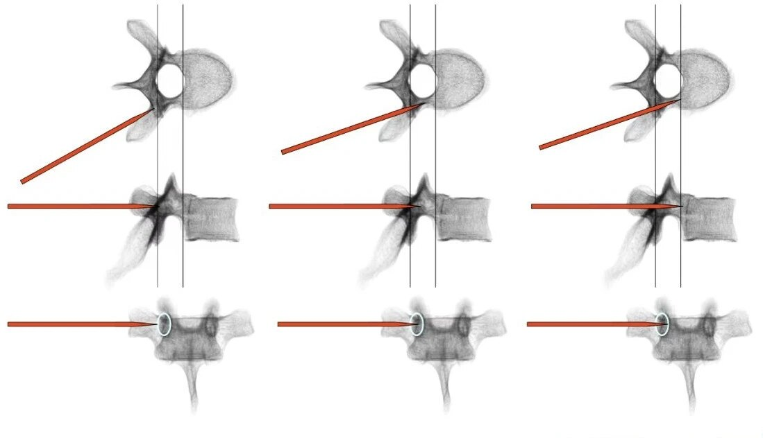 Для подтверждения безопасности пункции при ручной технике часто требуются неоднократные корректировки положения инструмента. Это неизбежно приводит к повторным попыткам пункции, повышая риск повреждения ножки позвонка, окружающих мягких тканей и близлежащих критически важных структур. Одновременно значительно увеличивается суммарная лучевая нагрузка как на пациента, так и на медицинский персонал вследствие частого рентгенологического контроля.