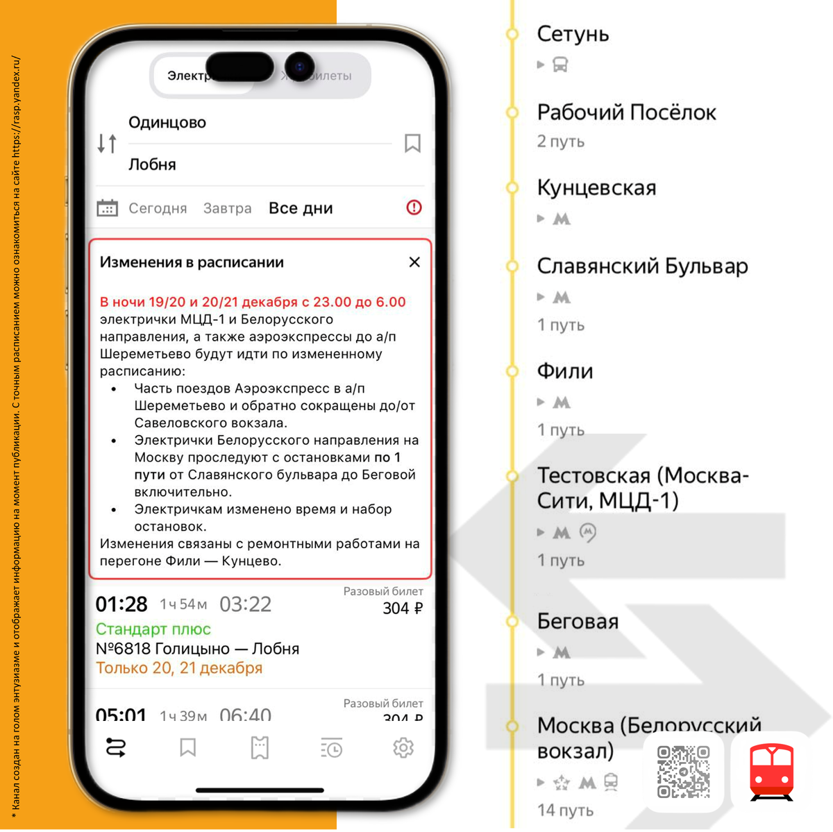 В ночи 19/20 и 20/21 декабря с 23.00 до 6.00 электрички МЦД-1 и Белорусского направления, а также аэроэкспрессы до а/п Шереметьево будут идти по измененному расписанию: ➡️ Часть поездов Аэроэкспресс в а/п Шереметьево и обратно сокращены до/от Савеловского вокзала. ➡️ Электрички Белорусского направления на Москву проследуют с остановками по 1 пути от Славянского бульвара до Беговой включительно. ➡️ Электричкам изменено время и набор остановок. Изменения связаны с ремонтными работами на перегоне Фили — Кунцево. 🔘 Я.Информатор | #МЦД1