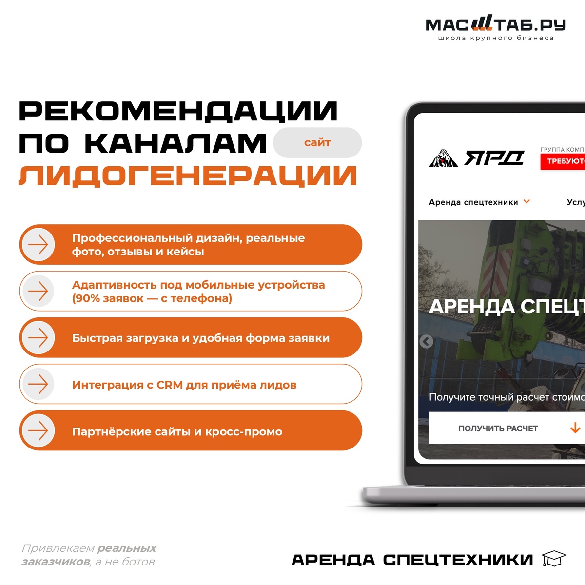 Канал лидогенерации:Сайт Факторы, влияющие на высокий качественный траффик: Инструменты для работы: Макет дизайна сайта, включающий в себя основные позиции по технике и услугам, с реальными фотоработами с площадок, благодарственными письма и отзывам Заказчиков, описанием кейсов по значимости объектов и выручке, информацией по заказу, возможностью оставить заявку в режиме «реального времени» (многостраничный сайт или лендинг). Комментарии от экспертов: Привлекаем реальных пользователей, ЛПР, а не ботов, так называемый «черный» SEO 2. Адаптивность для мобильных устройств. Инструменты для работы: Привлечение специалиста по разработке сайта с разработкой мобильной версии, а не этапного внедрения, т.к. 90% заявок осуществляются по мобильному приложению. Комментарии от экспертов: Мобильный поиск в основном осуществляется в рабочей обстановке, отсутствие ПК у прораба на рабочем месте и т.д. 3. Высокая скорость загрузки сайта. Инструменты для работы: Привлечение специалиста по разраб
