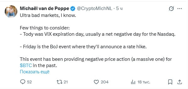 Несколько моментов, которые следует учесть: - Сегодня был день экспирации индекса VIX, обычно это негативный день для Nasdaq. - В пятницу состоится мероприятие Банка Японии, на котором будет объявлено о повышении процентной ставки. Это событие в прошлом приводило к значительному снижению цен BTC . Учитывая, что это произошло уже дважды, трейдеры ожидают, что это повторится, и поэтому я думаю, что мы уже наблюдаем распродажу, предшествующую этому событию. Я не думаю, что само событие является медвежьим сигналом, поэтому скажу так: 1-2 дня ещё негатива, а затем мы увидим позитивную реакцию на пути к 2026 году.