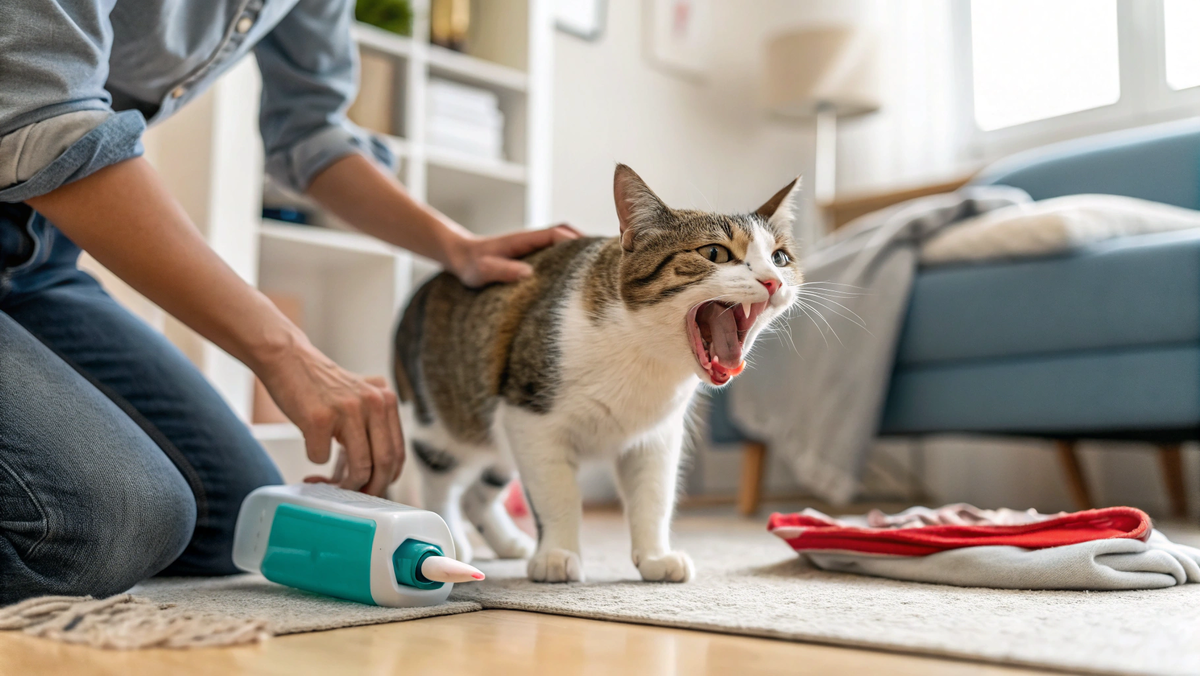 Не пытайтесь вызвать рвоту самостоятельно. Некоторые вещества при обратном выходе повреждают пищевод ещё сильнее. Не давайте молоко — это миф, который не работает и может навредить. Уберите остатки вещества, если кошка ещё рядом с ним. Заберите упаковку от препарата или бутылку от химии.