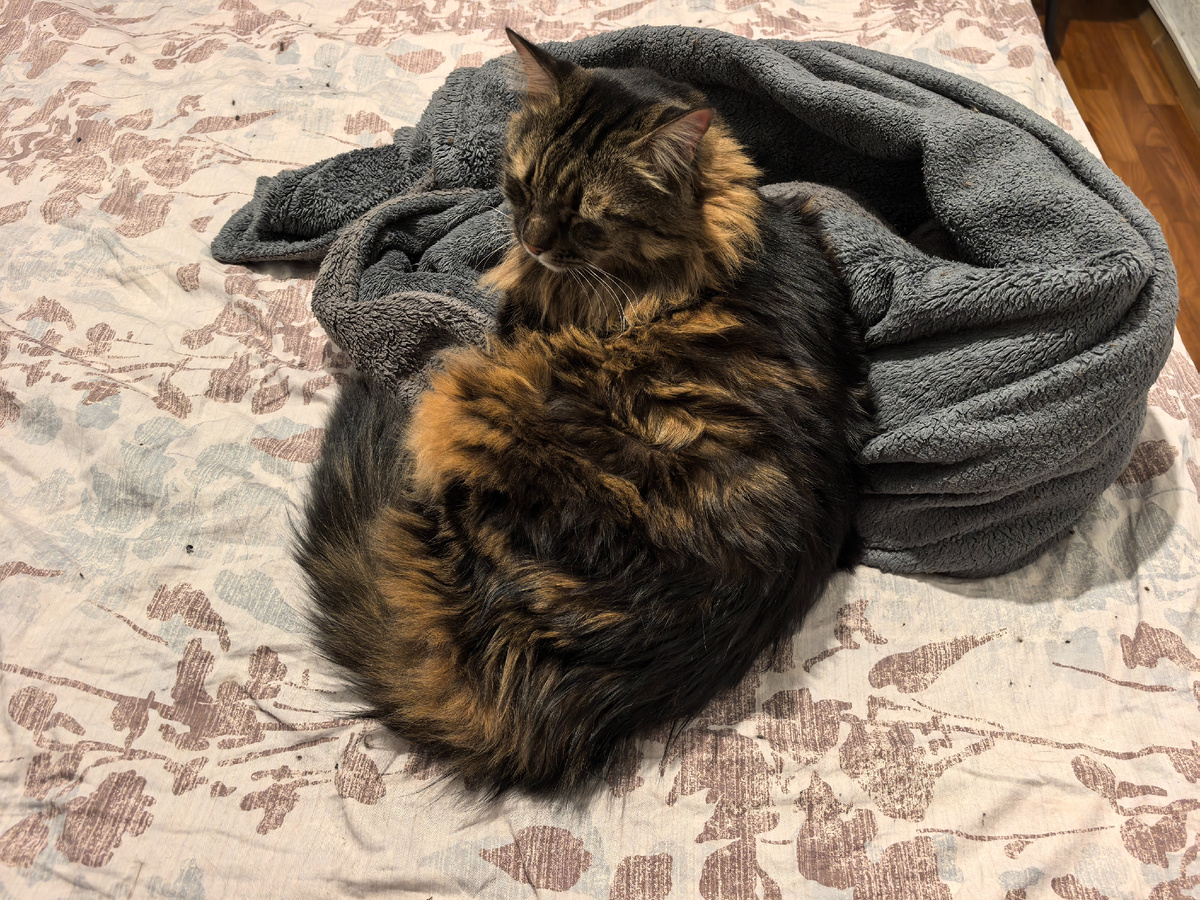 Я спал, хозяйка занималась своими делами, а тем временем халат успел постираться. Вот тут хозяйка и обнаружила сюрприз...