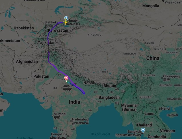 Второй день авиапроисшествий с самолетами Air Astana. Пассажиры летели из Алматы в Бангкок, однако до тайской столицы не добрались: самолет приземлился в Дели по технической причине. Как рассказал авиаперевозчик, на борту было 138 пассажиров. Сейчас Air Astana готовит самолет, который доставит путешественников в Бангкок. 🤔 По неподтвержденной информации журналиста Михаила Козачкова, во время полета раздался отчетливый хлопок в районе двигателя, после чего самолет начал резко снижаться, а в салоне появился запах гари. 📸 Фото: скриншот с сайта flightradar24.com - как летел самолет, прежде чем совершить вынужденную посадку