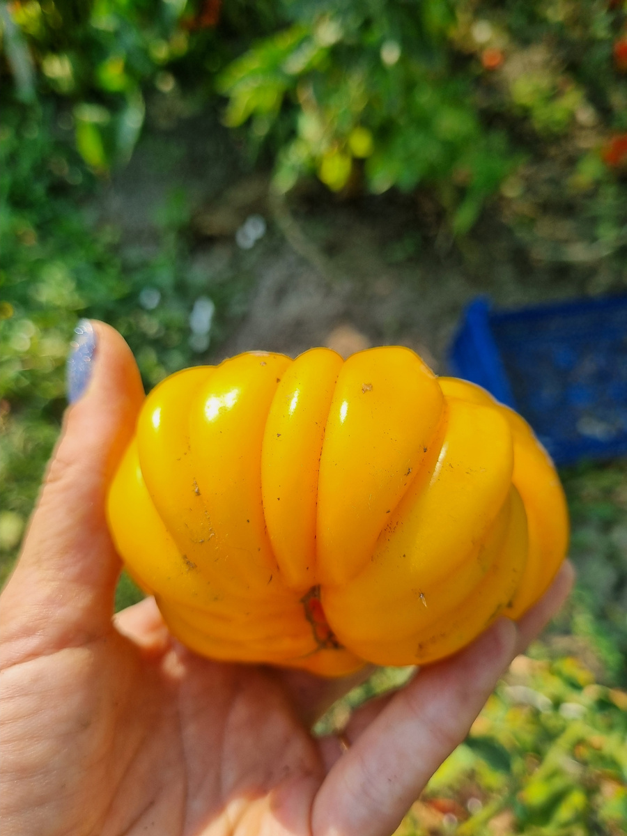 Красивый? Однозначно! Крупные рефленые плоды, как картинка. При созревании стали ярко-желтыми, как солнышки и тяжеленными, что ветки ломали.
