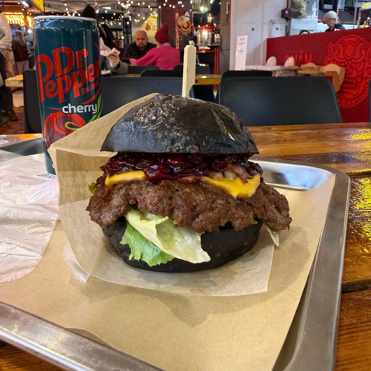 В составе: чёрная булочка, котлета из мраморной говядины, вишнёвый соус, томат, салат, сыр чеддер, карамелизованный лук и бекон.