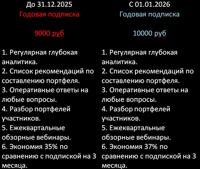 Уважаемые подписчики, с 1 января 2026 года стоимость годовой подписки на Премиум-клуб повысится с 9000 до 10000 рублей, трехмесячной - с