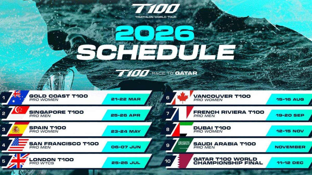Голд-Кост, 21–22 марта, Про женщины/любители Сингапур, 25–26 апреля, Про мужчины/любители Испания, 23–24 мая, Про женщины/любители Сан-Франциско, 6–7 июня, Про мужчины Лондон, 25–26 июля, Любители Ванкувер, 15–16 августа, Про женщины/любители Французская Ривьера, 19–20 сентября, Про мужчины Дубай, 12–15 ноября, Про женщины/любители Саудовская Аравия, ноябрь, Про мужчины Катар, финал чемпионата мира T100, 11–12 декабря, Все категории На этапах на Французской Ривьере и в Сан-Франциско будут представлены возможности для участия в соревнованиях любителей благодаря партнерству с Saint-Raphael Triathlon и Escape from Alcatraz Triathlon соответственно.