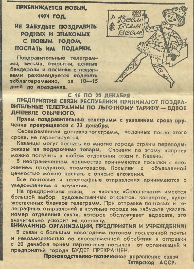 13 декабря 1970 года газета «Советская Татария» опубликовала вот такое объявление. Обратите внимание, за сколько дней было рекомендовано отправлять по почте посылки, бандероли, письма и поздравительные открытки. Внизу тексты двух поздравительных открыток с Новым годам из фондов Музея КАМАЗа.