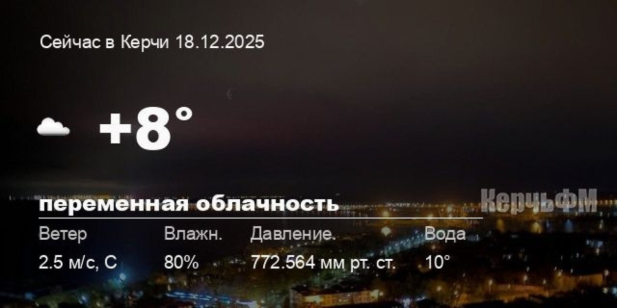Сегодня днем в Керчи, 18 декабря, ожидается пасмурная погода, температура воздуха от +6.7° до +9.8°С, ветер северный 2.59 м/с, порывы до 3.03 м/с, давление 772.6 мм рт. ст., влажность 75%. Ближайшей ночью ожидается пасмурная погода, температура +8°С. Завтра, 19 декабря, в течение суток ожидается пасмурная погода; ночью +8°С, днем +8°С, ветер северный 1.31 м/с. - Феодосия от +6.4° до +10.3°С, ⛅ переменная облачность, море: 6°C - Судак от +4.1° до +7... подробнее Подписывайся на КерчьФМ.РФ @kerchfm