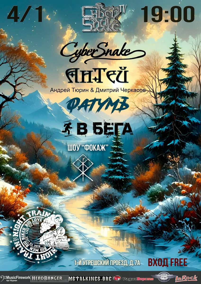4 января в клубе Night Train состоится выступление Cyber Snake, АнТэй, ФатумЪ, В Бега. Начало в 19.00. Вход свободный. Адрес: г.Москва, 1-й Угрешский пр., 9А, м. Угрешская.