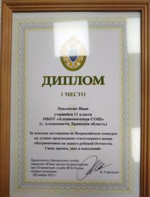 Ребята регулярно участвуют в творческих, интеллектуальных и патриотических проектах, демонстрируя не только знания и таланты, но и целеустремлённость, ответственность и умение достойно представлять свою школу. За последние годы школьники не раз становились призёрами и победителями престижных конкурсов, пополняя копилку достижений дипломами и грамотами. Эти успехи — результат серьёзной работы самих учащихся, поддержки педагогов и участия родителей, которые помогают детям верить в свои силы. В 2024–2025 учебном году особого признания удостоен выпускник Алешковичской школы Иван Павлютин. Он занял призовое место во Всероссийском творческом конкурсе «Пограничники на защите рубежей Отечества. Связь времён, эпох и поколений». В своей работе Иван отразил уважение к тем, кто охраняет границы страны, показал важность преемственности поколений и сохранения памяти о подвиге защитников. Сегодня Иван продолжает обучение уже в статусе студента ГБПОУ «Брянский строительный колледж им. профессора Н. Е.