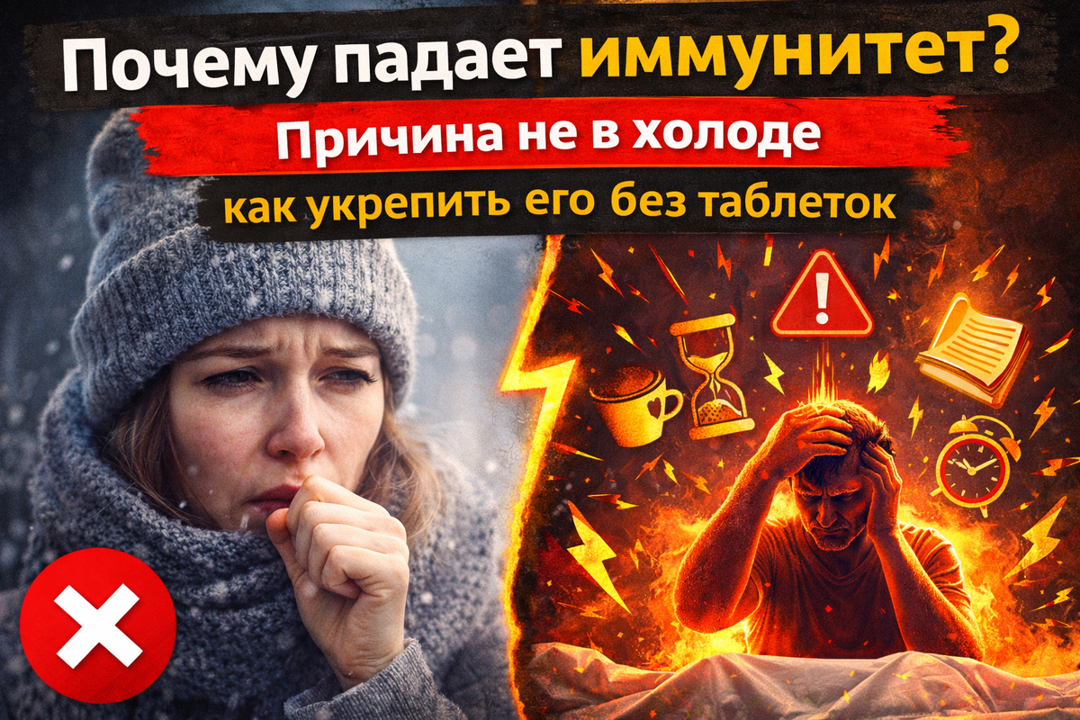 Важно! Всё, что я пишу на этом канале, — это интересные советы и рецепты, но не медицинские рекомендации. Хотите попробовать что-то из предложенного? Сначала поговорите с вашим врачом. Здоровье — прежде всего! Если вы ловите себя на мысли: «Я часто болею, в чём причина?» — эта статья для вас. Осень, зима или даже весна — простуды цепляются одна за другой. И часто находится объяснение: холод, сквозняк, кондиционер, промокшие ноги. Но давайте честно. Иммунитет падает не из-за холода. Причина совсем другая. И она куда ближе, чем кажется. Иммунная система — не броня и не щит. Это сложная, живая система, которая зависит от состояния всего организма. Когда люди спрашивают: «Почему падает иммунитет?» в 90% случаев ответ не в вирусах, а в образе жизни. Иммунитет слабеет, когда: организм живёт в постоянном напряжении; сон становится нерегулярным; еда перестаёт быть питательной; отдых откладывается «на потом». Холод — лишь фон. Настоящая причина — истощение. Если вы болеете чаще 4–6 раз в год —