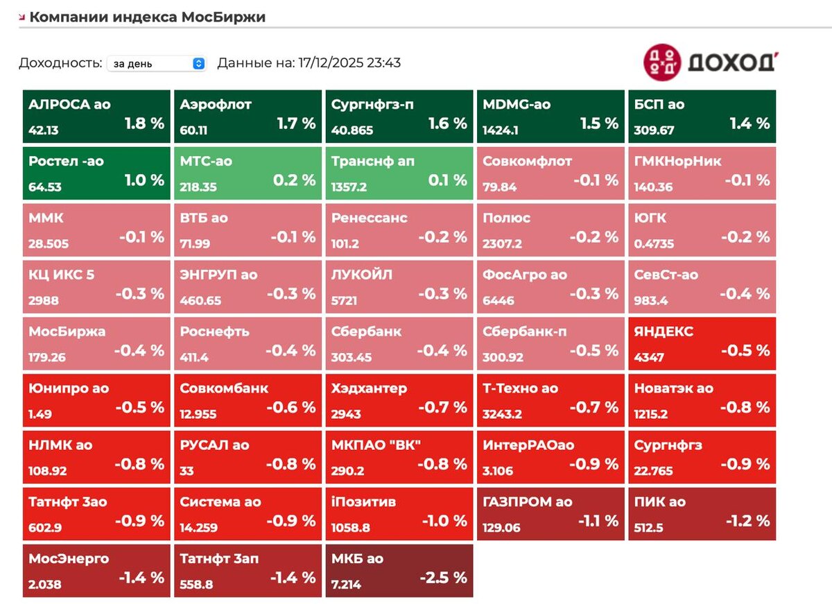Индекс мосбиржи в среду упал на 0,5% до 2763 пунктов. В течении дня ходил от 2740 до 2790 пунктов. Юань вырос на 1,21% до 11,39. Доллар снова выше 80. Нефть выросла на 3% до $60,6. Геополитика: Тут все стабильно, каждый день изобилует новостями. По словам Такера Карлсона Трамп должен был объявить о нападении на Венесуэлу сегодня утром, но по итогу ничего не сказал. На выходных Дмитриев опять поедет в Майами обсуждать мирный план. США готовят новые санкции, если РФ отвергнет мирное соглашение. Орбан заявил, что на повестке Еврокомиссии сегодня не будет стоять вопрос об экспроприации РФ активов. Много новостей и они часто противоречат друг другу - на этом рынок шатает. Инфляция: смешанные данные За последнюю неделю цены выросли на 0,05% - лучше ожиданий аналитиков. Инфляция упала в 7 раз год к году! Можно было бы такие кликбейтные заголовки делать, хотя на прошлых неделях было падение в 10 раз. Но это скорее шутка. В годовом выражении цены упали до 6,1% Инфляционные ожидания: год