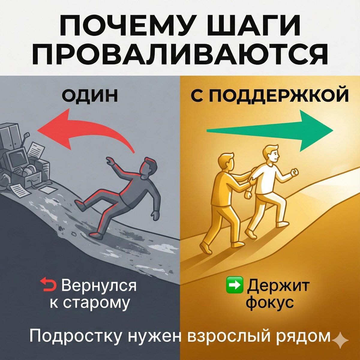 💔 Вчера дал 3 шага: осознание → выбор → эксперимент. Звучит просто. Но... Честность: Они проваливаются. В 9 случаях из 10. Я осознаю проблему. Называю причину. Начинаю эксперимент. Через неделю — вернулся к старому. Почему? ПРИЧИНА 1: Я ОДИН 🚶 Никто не удерживает фокус. Никто не напоминает, зачем я начинал. Через три дня старые паттерны возвращаются. Потому что подросток мечется. И когда он один — он всегда вернётся к старому. Это не слабость. Это механика. ПРИЧИНА 2: НЕТ СТРУКТУРЫ 📋 "Попробую сфокусироваться." Но как? На чём? Сколько времени? Эксперимент размытый. Без структуры — нет эксперимента. Есть только намерение. А намерения без структуры умирают. ПРИЧИНА 3: НЕТ ОТРАЖЕНИЯ 🪞 Я делаю шаг. Но не вижу, что происходит. Нужен кто-то, кто отражает: "Видишь? Ты снова вернулся к старому." "А почему?" Без отражения я не вижу паттернов. Я просто живу. На автомате. ЧТО НУЖНО? Нужна поддержка. Не мотивация. Не пинок. Поддержка = тот, кто держит фокус на переходе. Мой