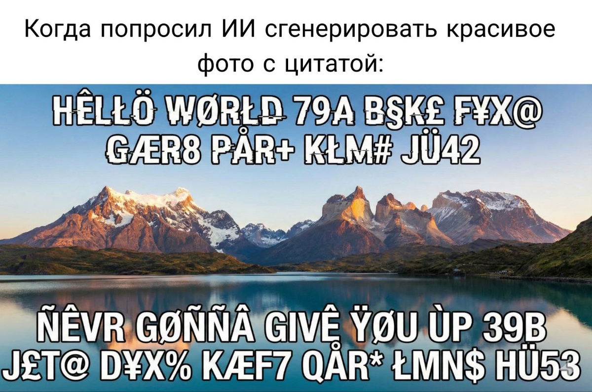В эпоху искусственного интеллекта мы все немного волшебники: достаточно пары слов, и нейросеть обещает сотворить для нас шедевр. Вот только реальность часто оказывается… другой. Особенно когда речь идёт о смешении машинного интеллекта и человеческих ожиданий. Один из таких моментов отлично отражён в новом мемe, который уже набирает просмотры на fun.guru. Сначала всё кажется обычным: красивая природная сцена и надпись про запрос к ИИ. Но если посмотреть внимательнее — текст надписи превращается в странный набор символов, словно нейросеть перепутала буквы, цифры и спецсимволы. А внизу идёт нечто вроде Rick Astley, но через фильтр абсурда. Именно этот контраст — между тем, что мы просим, и тем, что получаем — вызывает смех и узнавание. Ведь каждый, кто хоть раз работал с генераторами изображений, знает: идеального результата не бывает. А иногда странность получается настолько эпичной, что хочется поделиться ей со всеми знакомыми. Зачем такой мем нравится людям? Если коротко: мем отталкива
