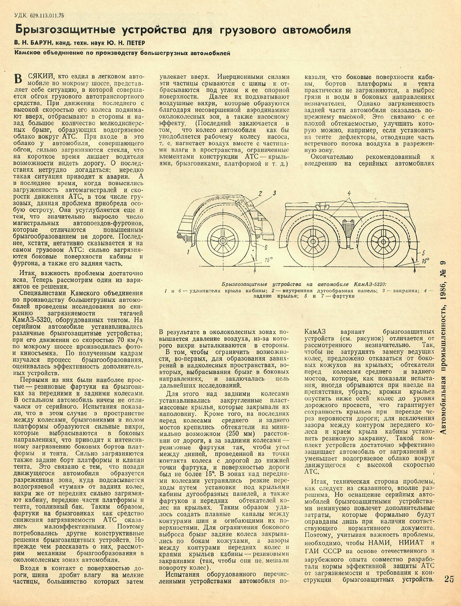В журнале «Автомобильная промышленность» №9 за 1986 год была опубликована статья Баруна Владимира Наумовича – главного конструктора КАМАЗа и Петера Юрия Никодимовича – начальника КБ отдела самосвалов и платформ под названием «Брызгозащитные устройства для грузового автомобиля». Авторы статьи предлагали свой вариант брызгозащитных устройств, которые прошли испытания на автомобилях КАМАЗ-5320.