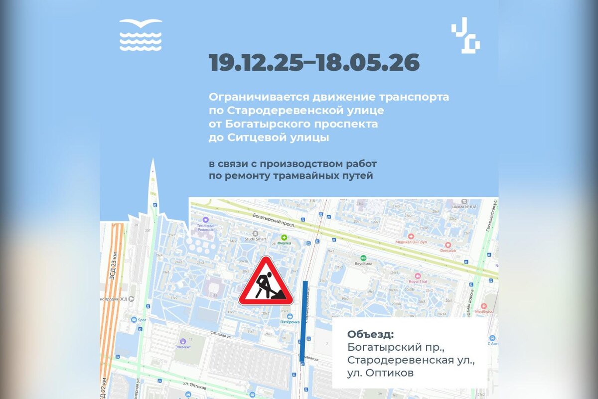 В связи с ремонтными работами на трамвайных путях вводится временное ограничение движения транспорта на участке Стародеревенской улицы. Как рассказали в пресс-службе администрации Приморского района Санкт-Петербурга, движение будет ограничено в период с 19 декабря 2025 года по 18 мая 2026 года на участке Стародеревенской улицы (от Богатырского проспекта до Ситцевой улицы). Водителям предлагается следующий путь объезда: Богатырский проспект – Стародеревенская улица – улица Оптиков. Все текущие ограничения движения, связанные с земляными, строительными и ремонтными работами, можно найти на интерактивной карте на официальном сайте ГАТИ. Ранее сообщалось, что из‑за коммунальной аварии в Петербурге изменены маршруты автобусов № 12, 95 и 159.