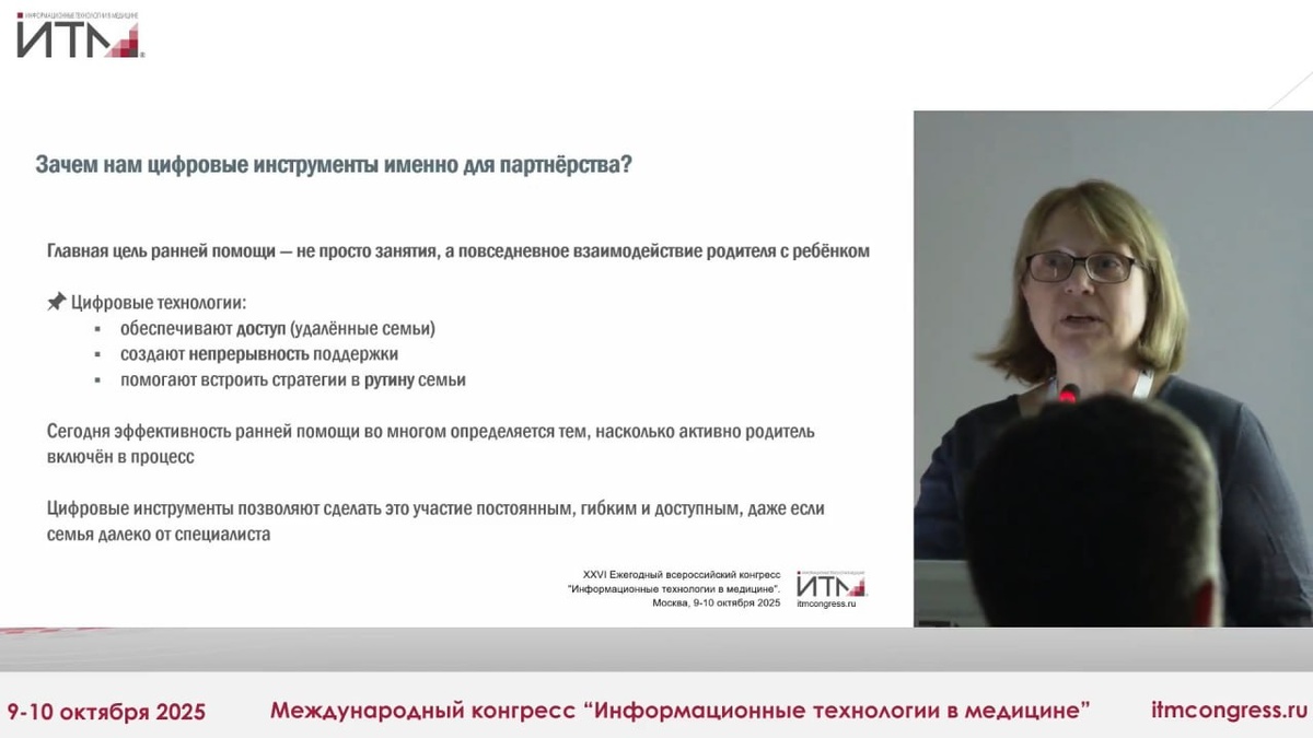 9% всех обучающих возможностей, которые есть у этого ребенка. Если к процессу подключаются родители, можно добиться использования всех обучающих возможностей. Но как обеспечить эту работу в партнерстве? Чтобы специалист мог постоянно поддерживать родителя, предоставлять ему необходимые знания (что за нарушение у ребенка, как он дальше будет развиваться, каковы его перспективы, какие методы являются научно доказанными, что можно делать самостоятельно дома)? Ответы на эти вопросы в своем выступлении на “ИТМ 2025” представила психолог, генеральный директор АНО ДПО “Санкт-Петербургский институт раннего вмешательства” Лариса Самарина. По ее мнению, самый эффективный и доступный способ - использовать цифровые технологии. “Мы должны помнить, что это не замена реальному взаимодействию, а его усиление. Цифровые инструменты позволяют родителям тренировать навыки своего ребенка в естественной среде, делать цели и прогресс, над которыми они трудятся в партнерстве со специалистами, прозрачными,