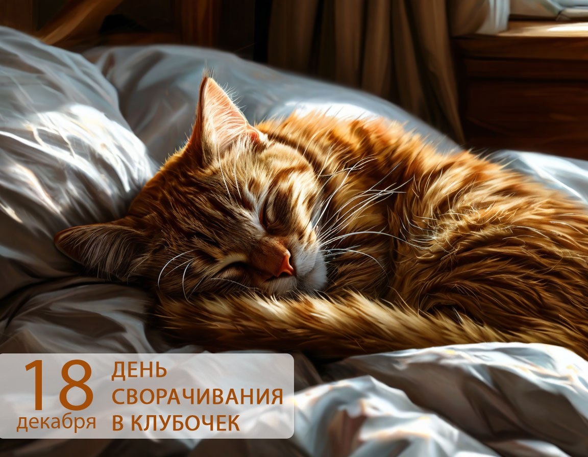 Сегодня 18 декабря - День сворачивания в клубочек 🐈 День сворачивания в клубочек - милый и уютный праздник, который как нельзя лучше подходит к воскресному вечеру. Вы думаете, что наши Мурзики и Шарики становятся пушистыми клубочками просто так, от нечего делать? Нет, они тоже таким образом ищут уютное и мягкое местечко, где можно расслабиться и нежиться под заботой того, кто их любит. 🎉 — буду праздновать сам. 🤗 — есть кого поздравить. 👎 — не праздную.