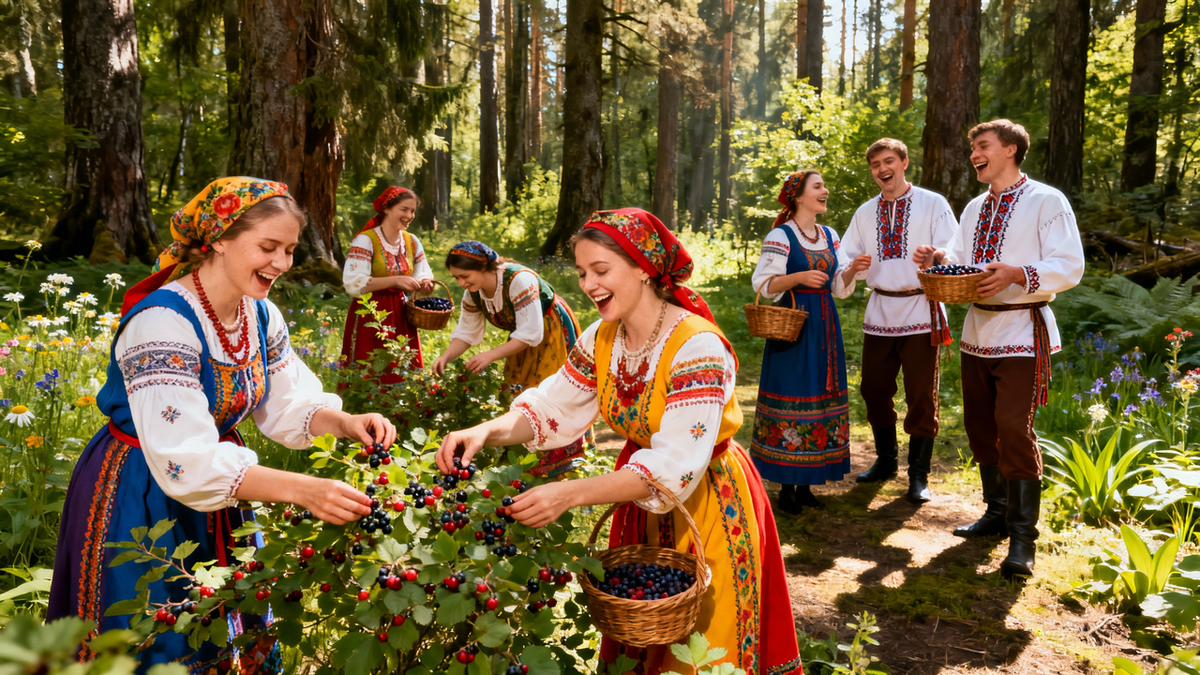 Они росли в дремучих лесах Русского Севера — небольшие, сладкие, словно крошечные солнца, пробивающиеся сквозь густые ветви деревьев. Лесная земляника, черника, голубика, клюква и брусника веками обитали рядом с человеком. Но мало кто задумывался тогда о той глубокой связи, которую природа установила между ягодами и культурой. Давным-давно русские крестьяне собирали ягоды после тяжёлого крестьянского труда. Сезон сбора был своеобразным праздником природы и человеческого упорства. Каждая семья бережно относилась к запасам лесных плодов. Ягоды превращались в варенье, сушились, замораживались, консервировались и сохранялись впрок. Собирая лесную ягоду, человек соединялся с природой. Вековые деревья становились свидетелями ежедневных забот и радостей семьи. Эти маленькие плоды стали символами тепла домашнего очага и памяти о детстве. Со временем сбор ягод стал важной частью народных традиций. Девушки собирались семьями и ходили по лесу, напевая песни и ведя беседы. Мужчины же традиционно о