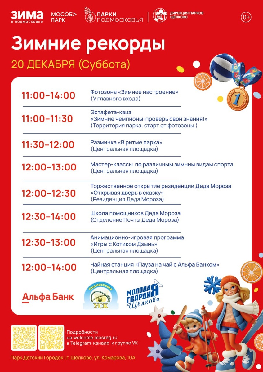 » ⏰ 20 декабря (суббота) с 11:00 до 14:00 в парке «Детский Городок» пройдёт насыщенная программа. 🔴 Вас ждут фотозона «Зимнее настроение», эстафета-квиз «Зимние чемпионы», мастер-классы по зимним видам спорта, школа помощников Деда Мороза, анимационная программа «Игры с Котиком Дзынь», чайная станция от Альфа Банка и торжественное открытие резиденции Деда Мороза. Приходите всей семьёй! #культуращёлково #зимавподмосковье