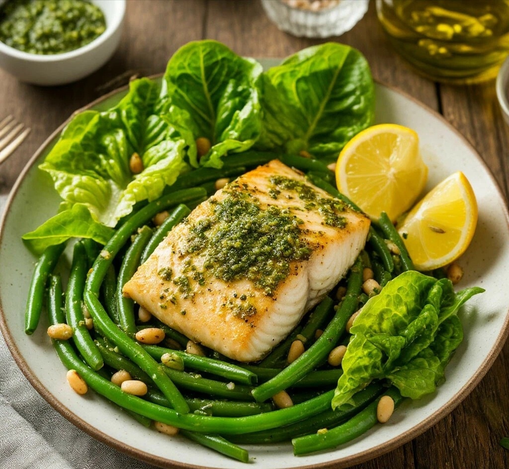 ТЕПЛЫЙ САЛАТ С ТИЛАПИЕЙ, ЗЕЛЕНОЙ ФАСОЛЬЮ И СОУСОМ ПЕСТО 🌿