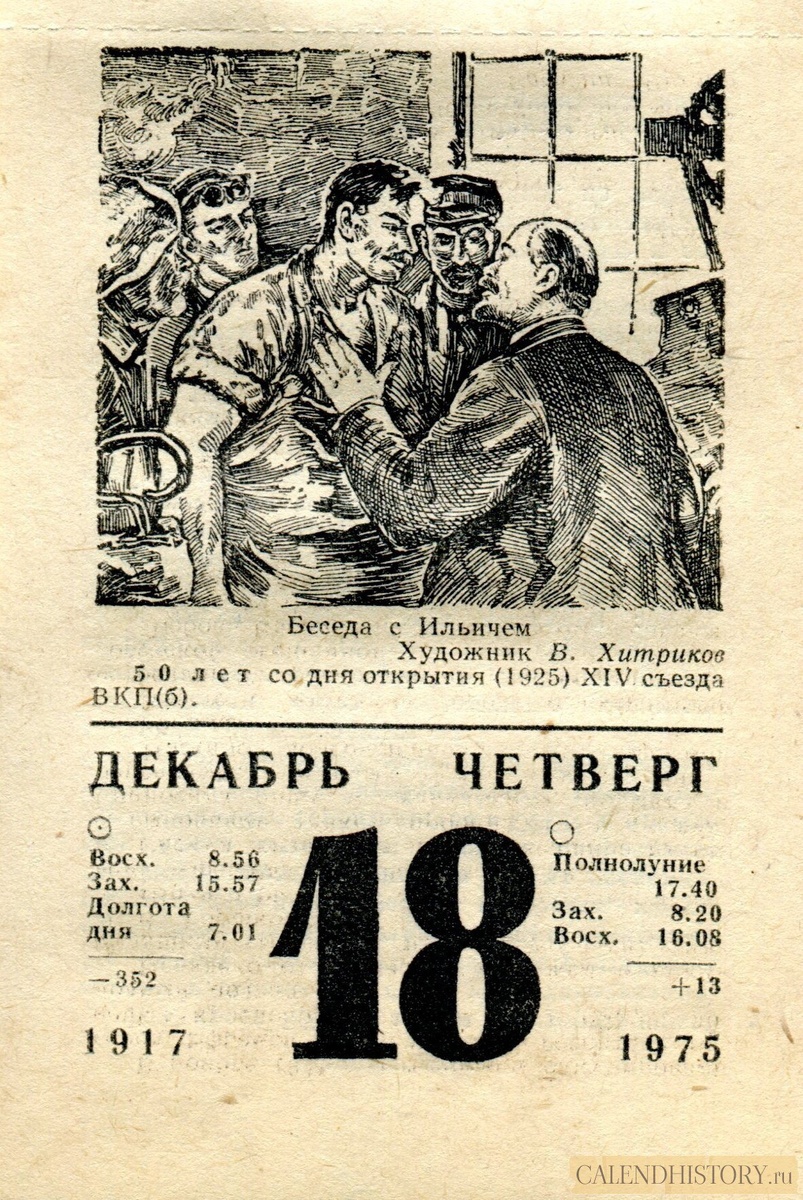 18 декабря 1975-го года — Календарь для женщин Беседа с Ильичем. Художник В. Хитрико 50 лет со дня открытия (1925) XIV съезда ВКП(б). Больше советских отрывных календарей смотрите у нас на сайте - calendhistory.ru https://calendhistory.ru/18-dekabrja-1975-go-goda-kalendar-dlja-zhenshhin/